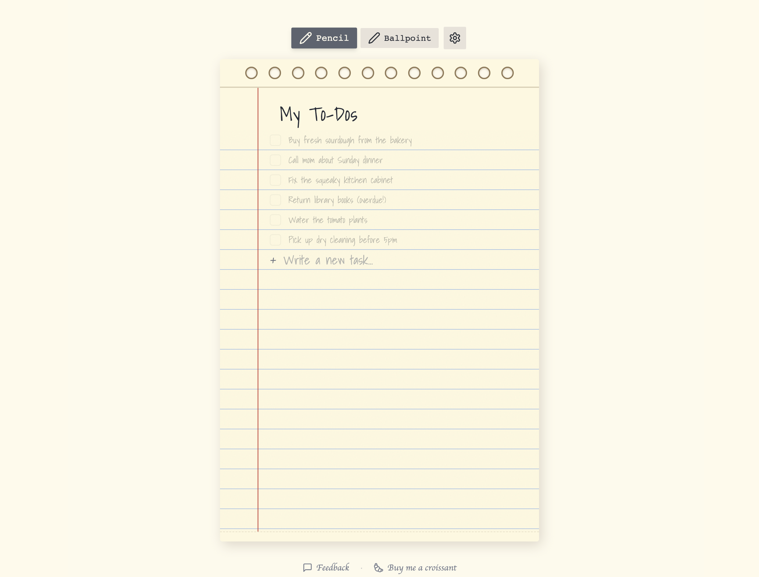 Digital to-do lists are efficient. Crossing something off a handwritten list is satisfying. I wanted both. Scribble Scribble is a vintage-style to-do list that replicates the look, feel, and sound of pen on paper. Best on desktop — and turn your volume up.