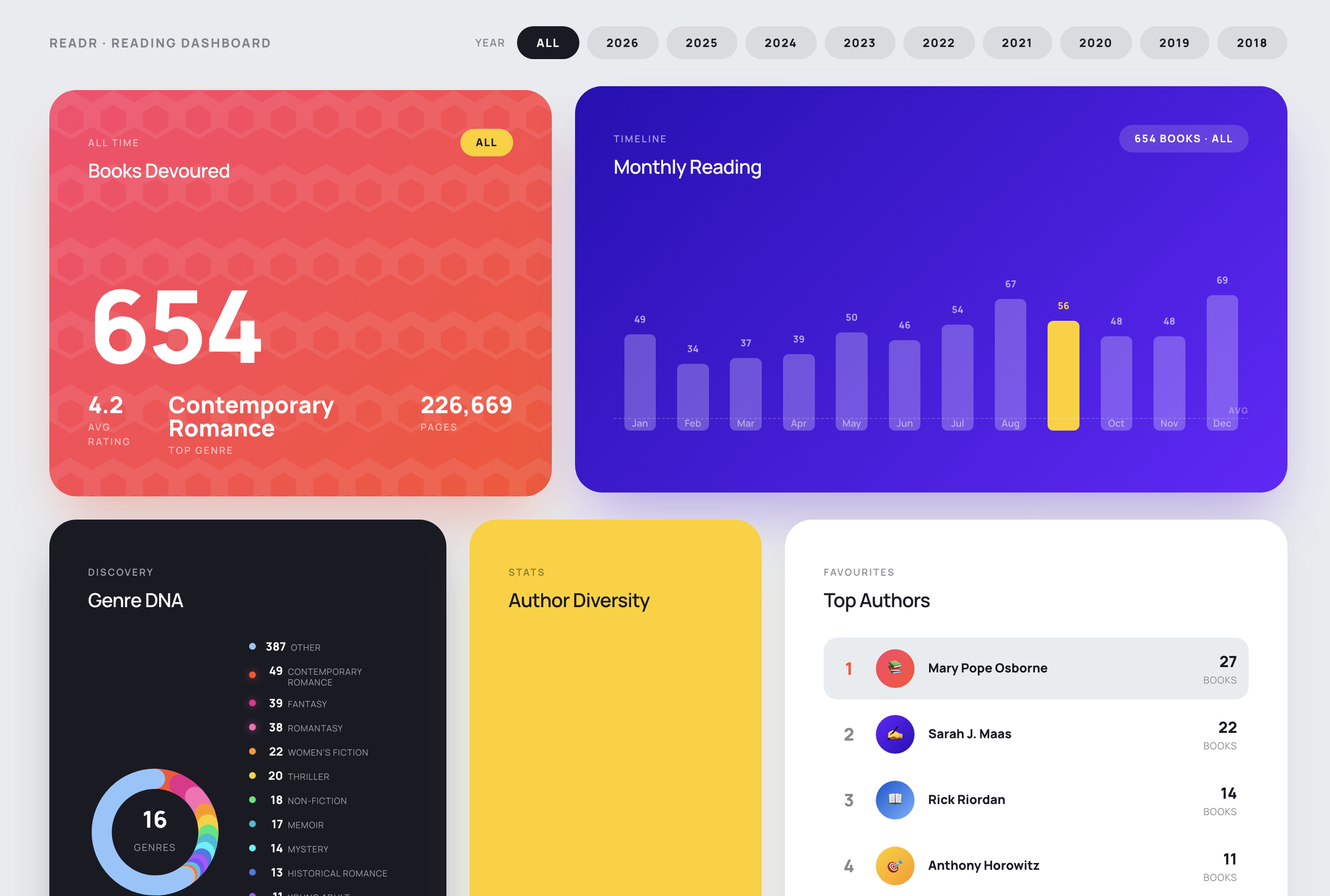 Goodreads tracks what you read. It just won't tell you much about it. I exported my reading history and built a personal dashboard with the detailed analytics I actually wanted — reading pace, genre breakdowns, ratings over time, and more.
